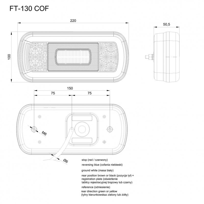 LED FT-130 COF - lampa spate cu LED si 6-funcții cu o lumina de mers înapoi, cablu de 1m